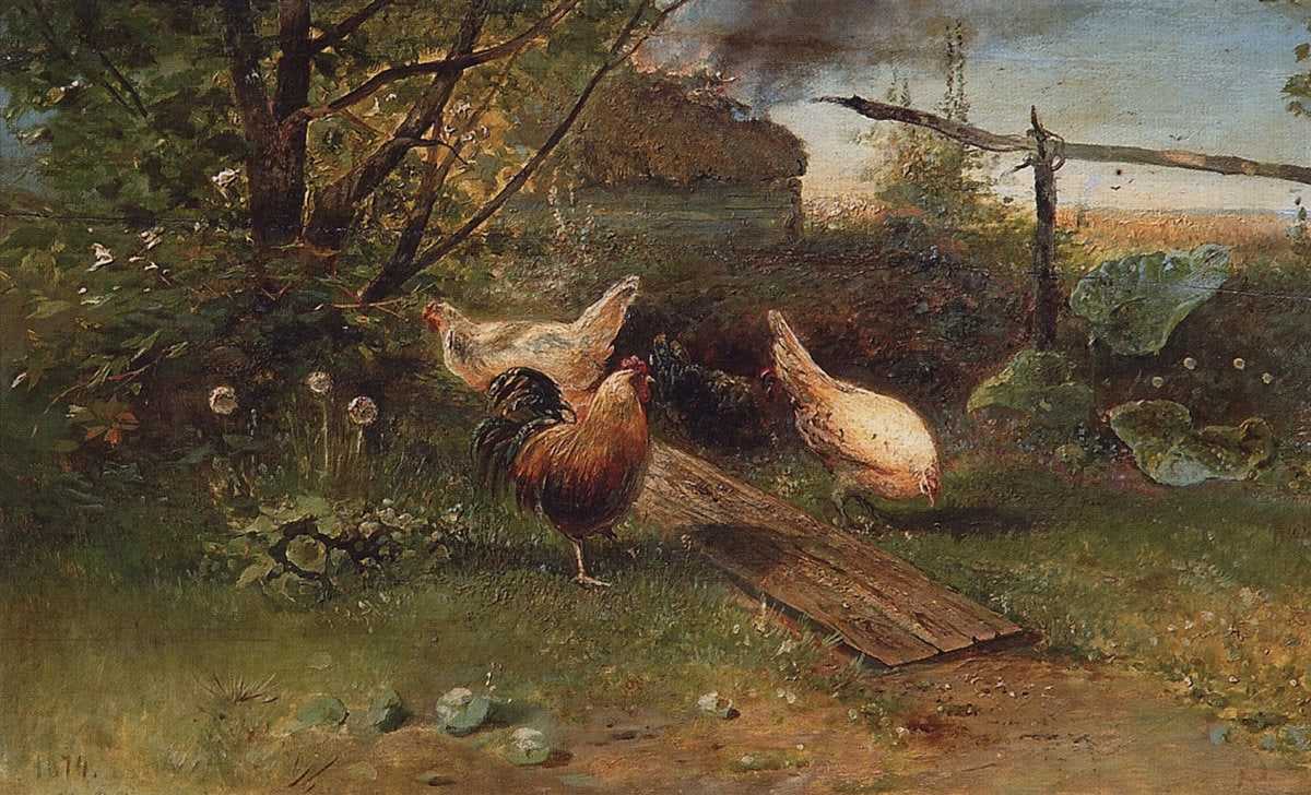 Полотно “Куры на задворках” было создано в 1874 году. Будничный отрывок деревенской жизни отобразил художник на этой картине.