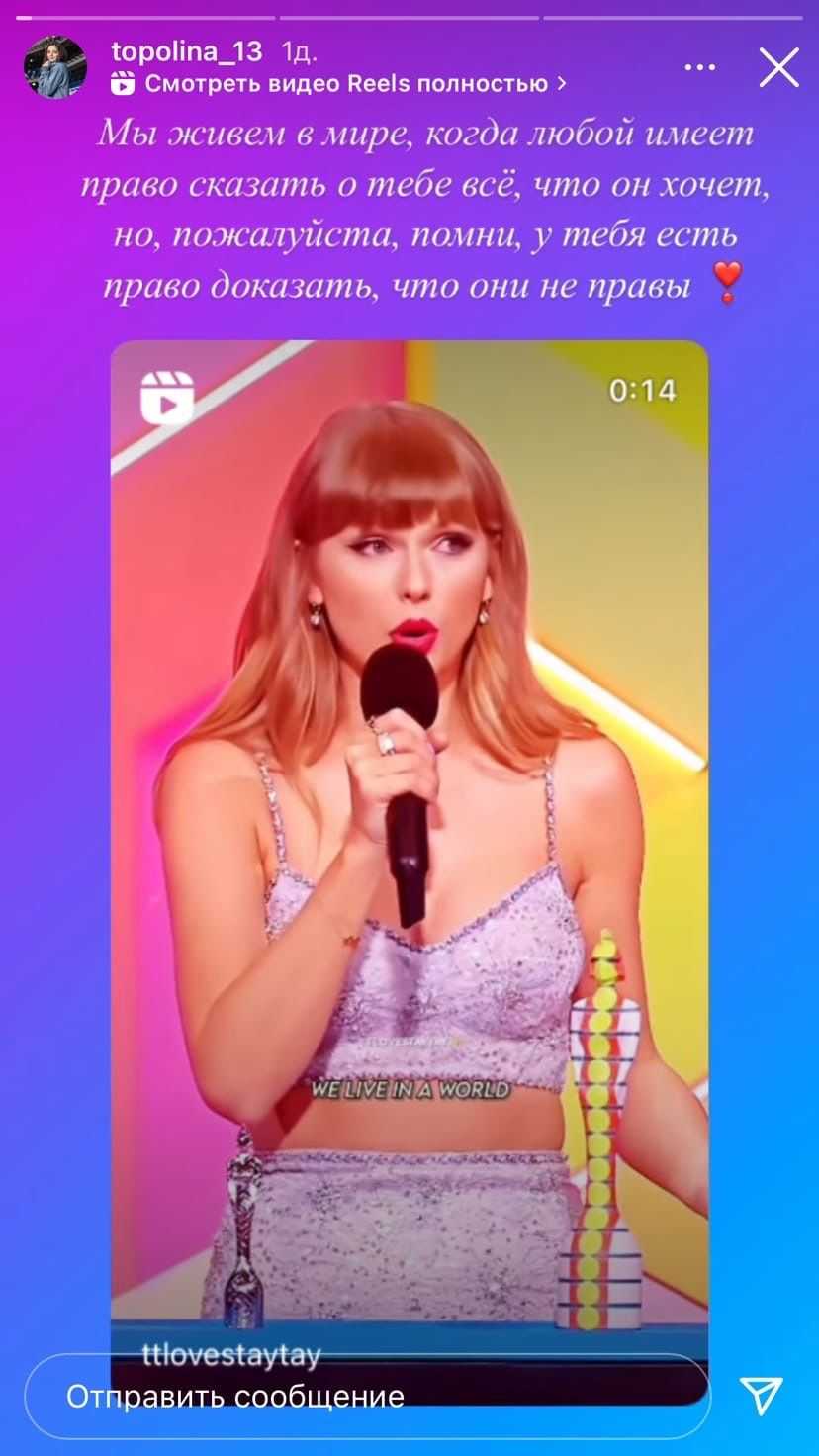 Сама Полина на публикацию материала среагировала цитатой в сторис: «Мы живем в мире, когда любой имеет право сказать о тебе все, что хочет, но, пожалуйста, помни, у тебя есть право доказать, что они не правы».