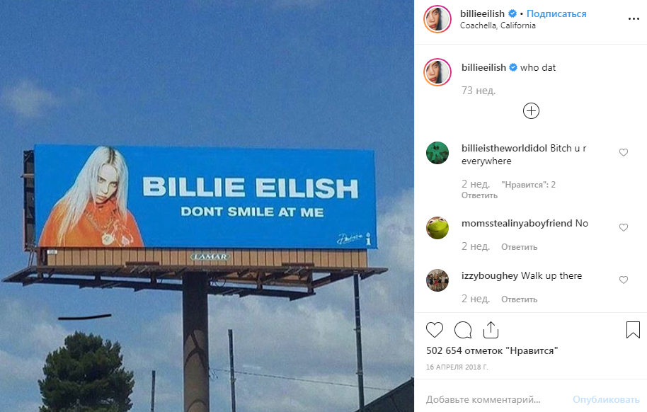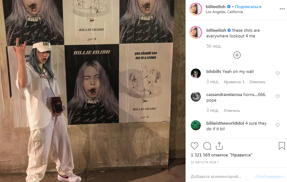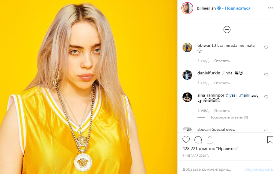 Она несколько раз побила рекорд самой быстрой понравившейся фотографии на платформе. Совсем недавно ей это удалось сделать с фотографией для Vogue, на которой Билли Айлиш изображена в новом образе и в сексуальном корсете. Пост набрал миллион лайков менее чем за шесть минут. Вы можете положиться на более чем 95,3 миллиона подписчиков Билли в Instagram (по состоянию на ноябрь 2021 года)