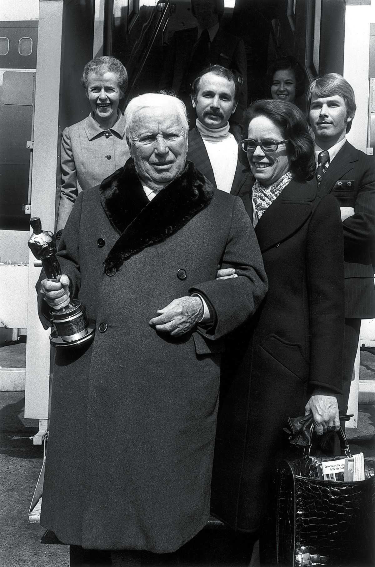 Чарли Чаплин с женой Уной в руках с «Оскаром», полученным в Голливуде, после прибытия в аэропорт Лондона, 13 апреля 1972 г.