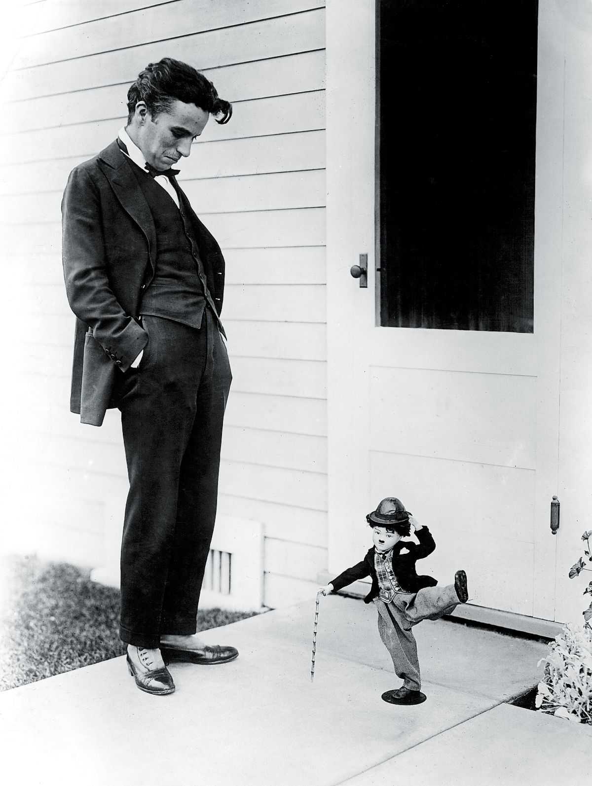 Чарли Чаплин смотрит на куклу, одетую в знакомые котелок, мешковатые брюки и с тростью, 1929 г.