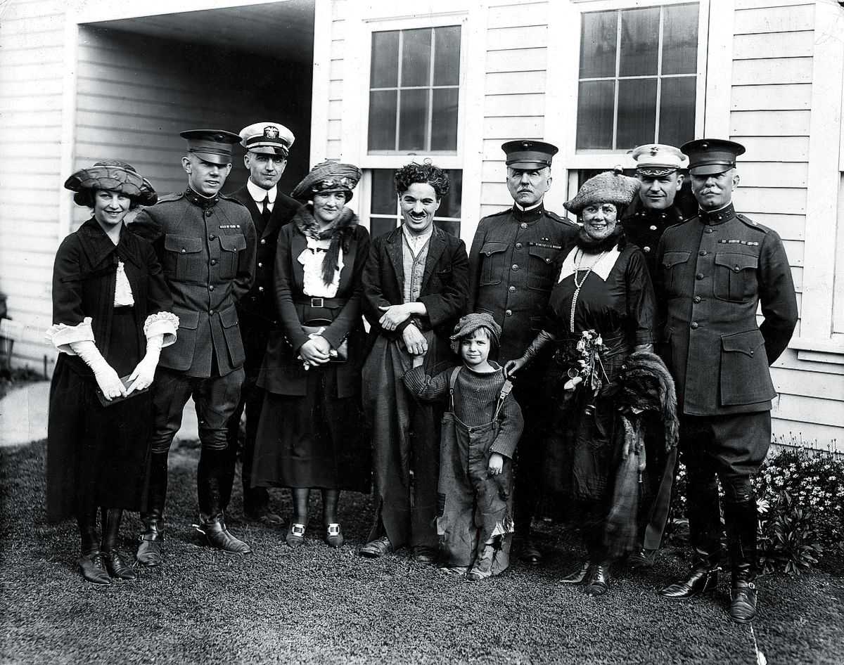 Генерал-майор Барнетт, командующий корпусом морской пехоты США, посещает Чарли Чаплина и маленького актера Джеки Кугана на съемках фильма «Малыш», 1920 г.