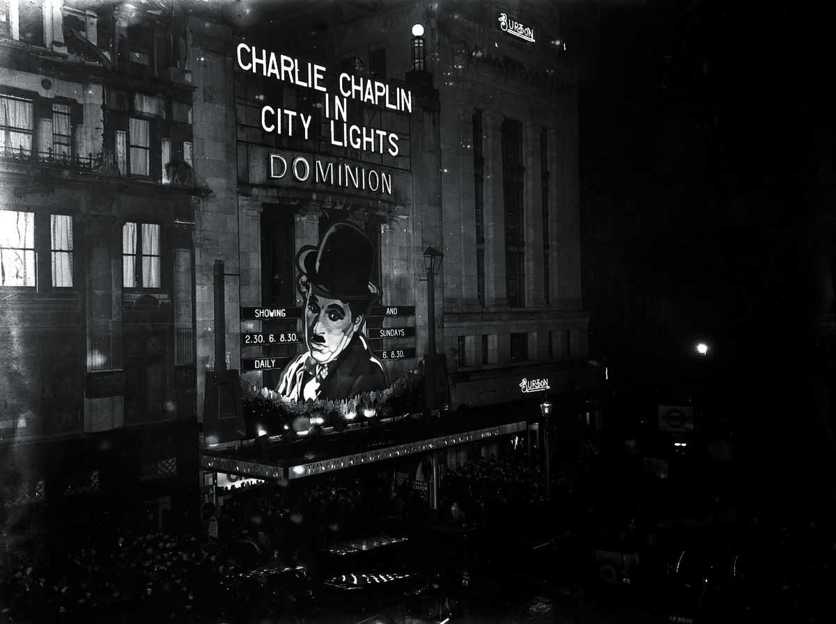 Толпа собирается у лондонского кинотеатра «Доминион» в ночь премьеры фильма Чарли Чаплина «Огни большого города», 27 февраля 1931 г.