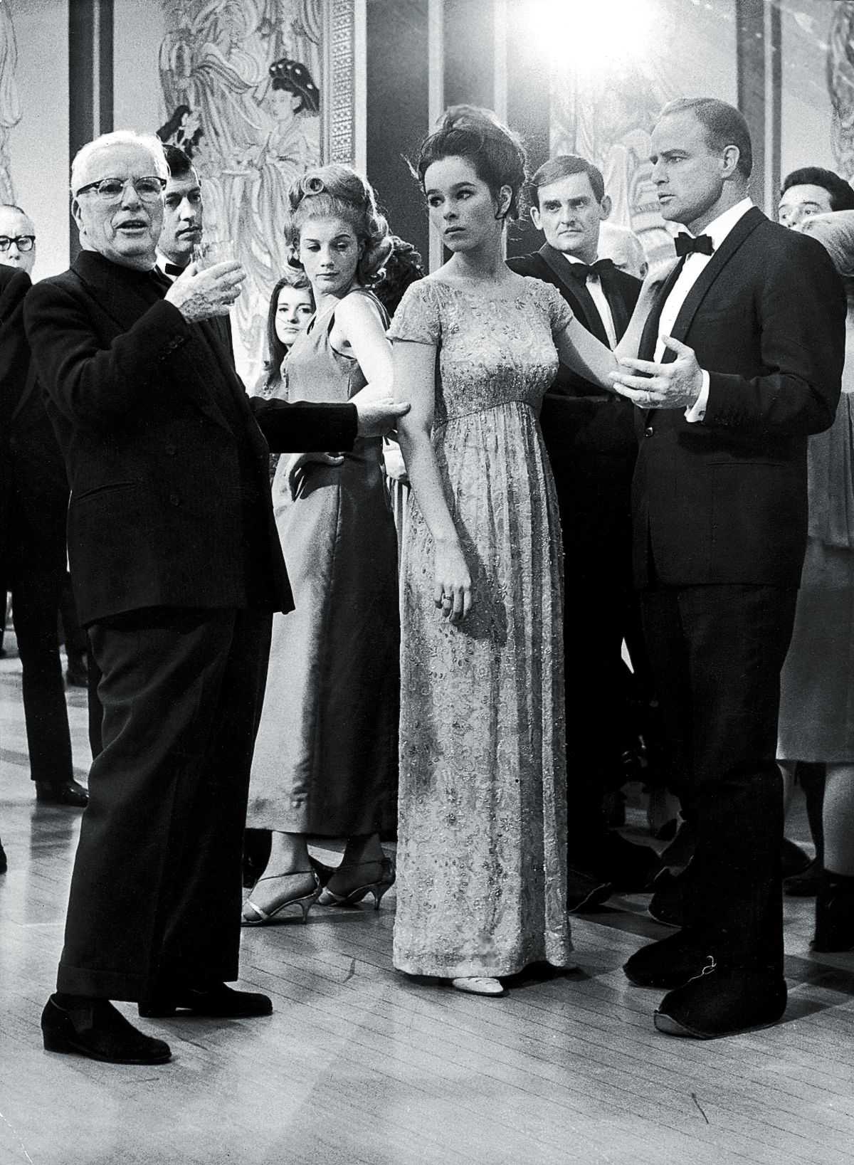 Режиссер Чарли Чаплин с дочерью Джеральдин и Марлоном Брандо репетируют сцену из фильма «Графиня из Гонконга», 18 марта 1966 г.