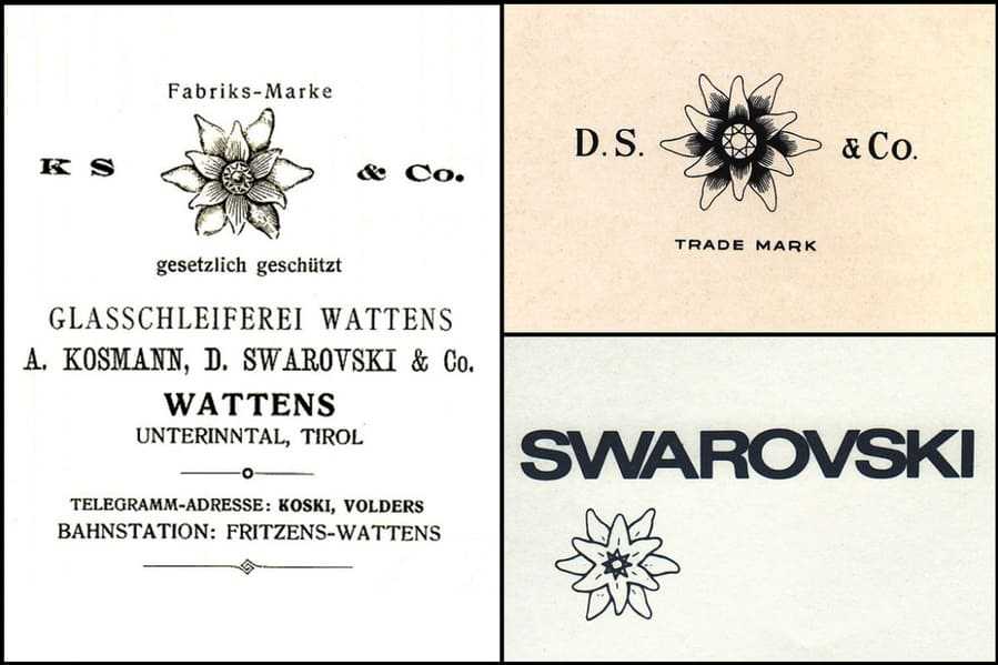 1899 год, реклама компании Kosmann, D. Swarovski & Co., с изображением цветка эдельвейса на логотипе. Изначально на логотипе компании был изображён цветок эдельвейса. Он использовался, как символ Альпийских гор, рядом с которыми и располагалось производство продукции Swarovski.