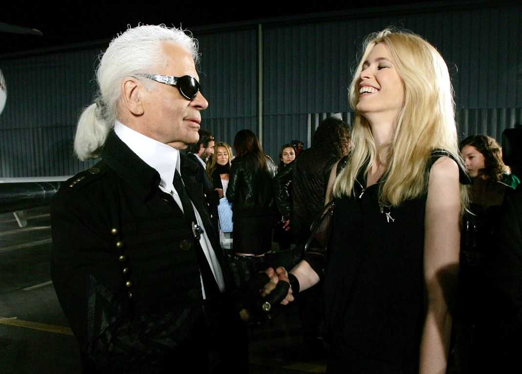 Дизайнер Карл Лагерфельд и модель Клаудия Шиффер на шоу Chanel 2007/8 в Санта-Монике, 18 мая 2007 г.