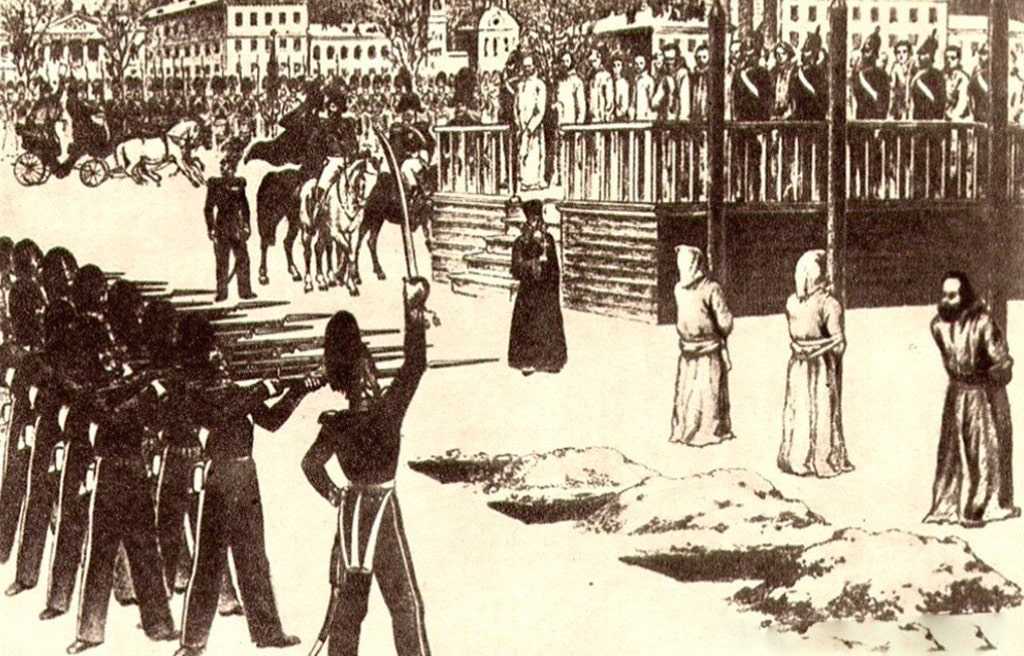 После полугодового следствия суд приговорил Михаила Петрашевского и двадцать активных кружковцев к расстрелу. Здесь следует отметить довольно таки уникальный случай, произошедший в момент казни осужденных. Утром третьего января 1850 года, когда расстрельная команда подняла свои винтовки, а заговорщиков от смерти отделял только взмах руки офицера и команда «Пли!» — казнь вдруг отменили.