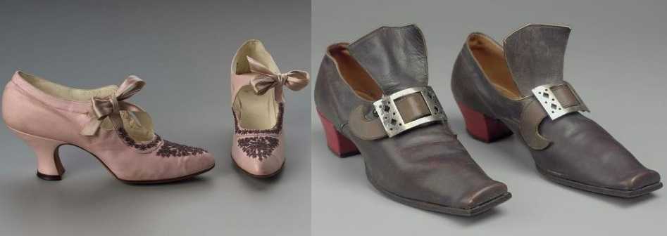 - К 17-18 векам появились женские туфли из ткани. Подошва была выше прежних. Отделка представлена расшитыми узорами, украшениями, бантами из лент. В моде высокие каблуки красного окраса. Мужчины предпочитали ботфорты с квадратными носами. Незнатные люди носили деревянные сабо или не имели обуви.