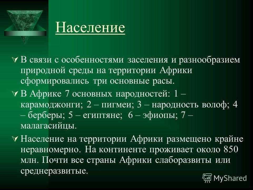 Население В связи с особенностями заселения и разнообразием природной среды на территории Африки сформировались три основные расы. В Африке 7 основных народностей: 1 – карамоджонги; 2 – пигмеи; 3 – народность волоф; 4 – берберы; 5 – египтяне; 6 – эфиопы; 7 – малагасийцы. Население на территории Африки размещено крайне неравномерно. На континенте проживает около 850 млн. Почти все страны Африки слаборазвиты или среднеразвитые.