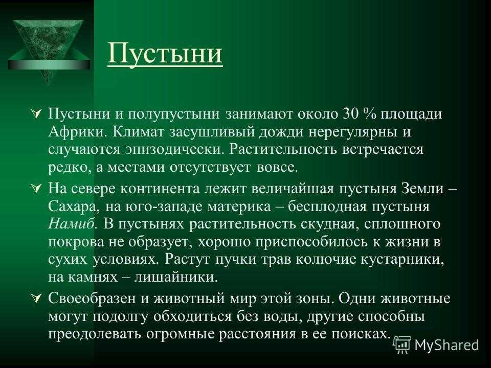 Пустыни Пустыни и полупустыни занимают около 30 % площади Африки. Климат засушливый дожди нерегулярны и случаются эпизодически. Растительность встречается редко, а местами отсутствует вовсе. На севере континента лежит величайшая пустыня Земли – Сахара, на юго-западе материка – бесплодная пустыня Намиб. В пустынях растительность скудная, сплошного покрова не образует, хорошо приспособилось к жизни в сухих условиях. Растут пучки трав колючие кустарники, на камнях – лишайники. Своеобразен и животный мир этой зоны. Одни животные могут подолгу обходиться без воды, другие способны преодолевать огромные расстояния в ее поисках.