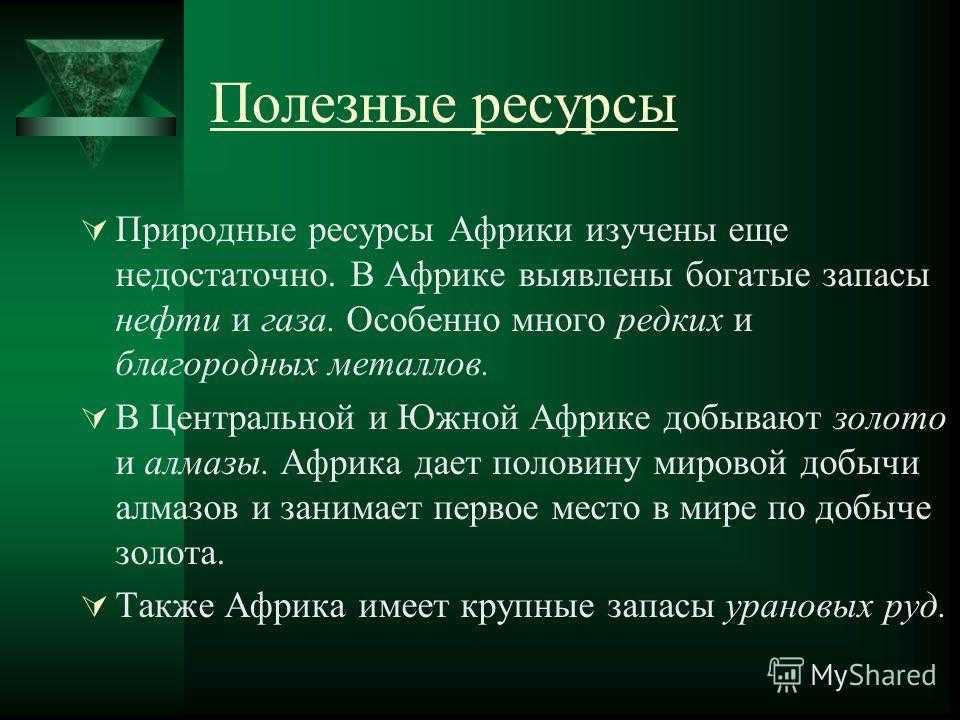 Полезные ресурсы Природные ресурсы Африки изучены еще недостаточно. В Африке выявлены богатые запасы нефти и газа. Особенно много редких и благородных металлов. В Центральной и Южной Африке добывают золото и алмазы. Африка дает половину мировой добычи алмазов и занимает первое место в мире по добыче золота. Также Африка имеет крупные запасы урановых руд.