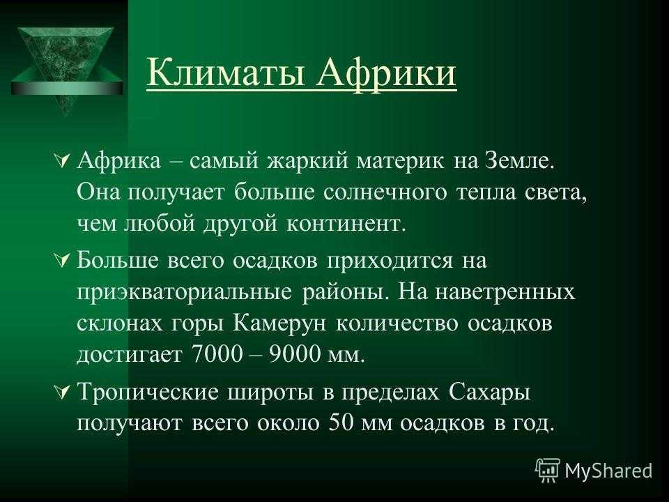 Климаты Африки Африка – самый жаркий материк на Земле. Она получает больше солнечного тепла света, чем любой другой континент. Больше всего осадков приходится на приэкваториальные районы. На наветренных склонах горы Камерун количество осадков достигает 7000 – 9000 мм. Тропические широты в пределах Сахары получают всего около 50 мм осадков в год.