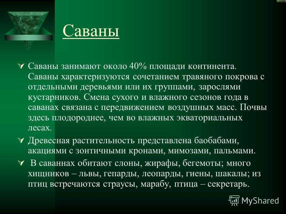 Саваны Саваны занимают около 40% площади континента. Саваны характеризуются сочетанием травяного покрова с отдельными деревьями или их группами, зарослями кустарников. Смена сухого и влажного сезонов года в саванах связана с передвижением воздушных масс. Почвы здесь плодороднее, чем во влажных экваториальных лесах. Древесная растительность представлена баобабами, акациями с зонтичными кронами, мимозами, пальмами. В саваннах обитают слоны, жирафы, бегемоты; много хищников – львы, гепарды, леопарды, гиены, шакалы; из птиц встречаются страусы, марабу, птица – секретарь.