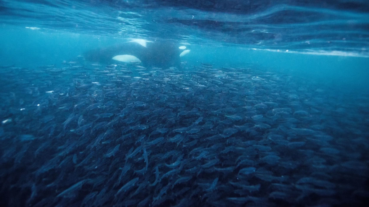 Подводный снимок косатки рядом с большой группой сельди у Анденеса в Норвегии. (Изображение предоставлено: Wildestanimal / Getty Images)