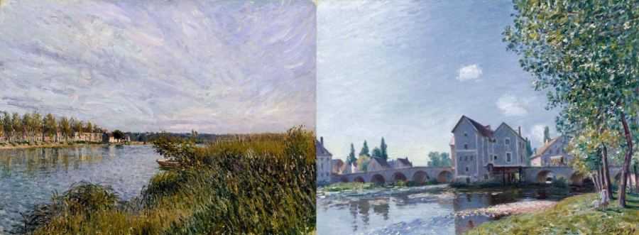Картины Альфреда Сислея. Слева: Вид на Сен-Мамес. 1880 г. Художественный музей Уолтерса. Балтимор, США. Справа: Мост в Море. Утро. 1891 г. Частная коллекция.