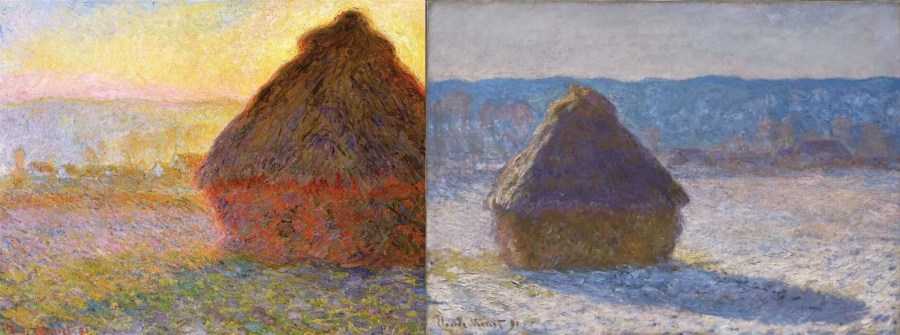 Картины Клода Моне в Музее изящных искусств в Бостоне. Слева: Стога сена на закате в Живерни, 1891. Справа: Стог сена (эффект снега), 1891.