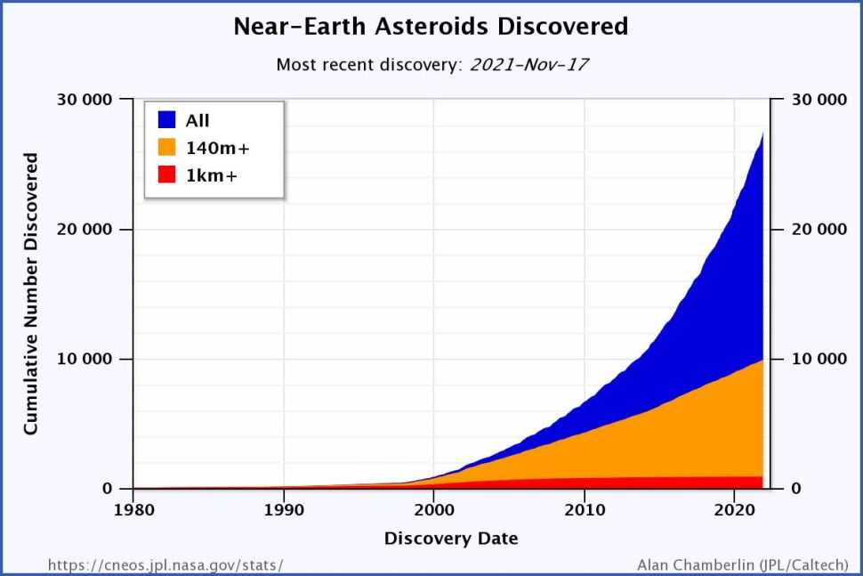 Диаграмма, показывающая общее количество сближающихся с Землей астероидов, найденных за последние годы и разделенных на категории по размерам.