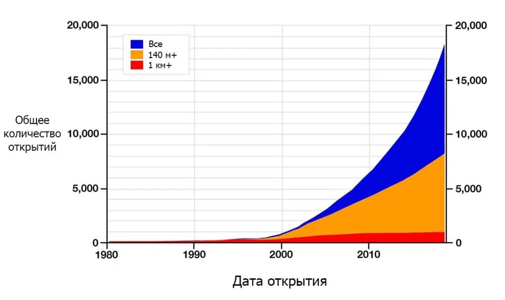 Количество астероидов обнаруженных неподалёку от Земли начиная с 1980г.