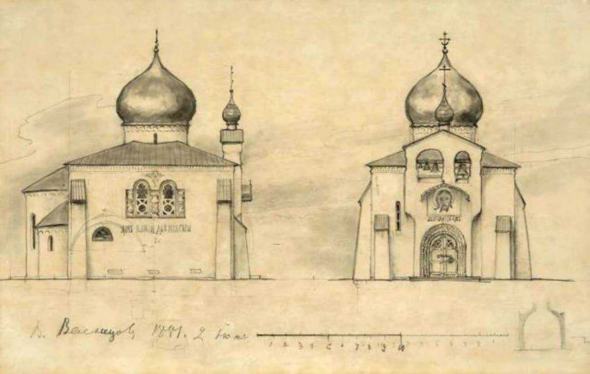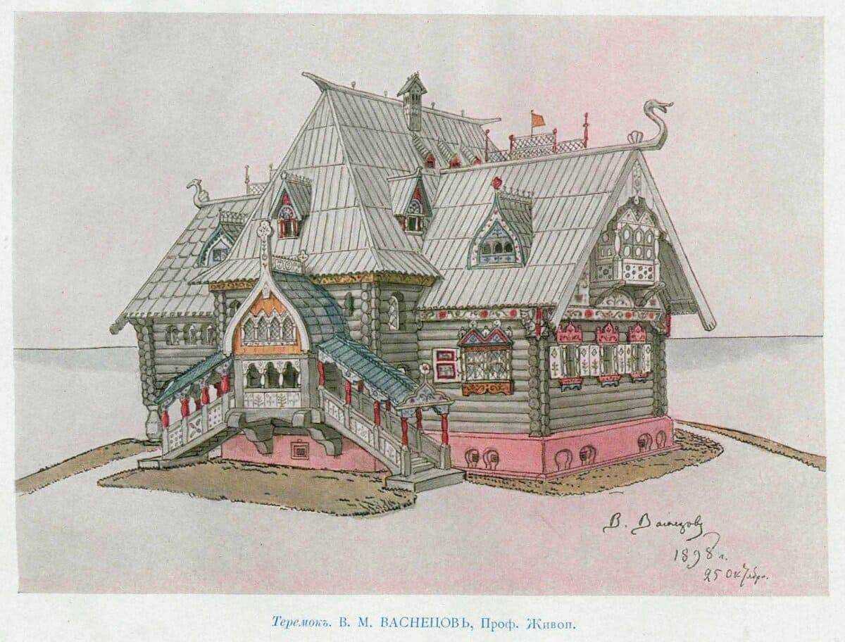 Собственное видение мира привнес Васнецов в архитектуру. «Русский стиль» для него означал не подражание старинным мотивам, а разумное заимствование особых свойств зодчества Древней Руси. С его легкой руки в усадьбе Абрамцево появились церковь Спаса Нерукотворного, выстроенная в соответствии с псковско-новгородской традицией, и сказочная беседка «Избушка на курьих ножках».
