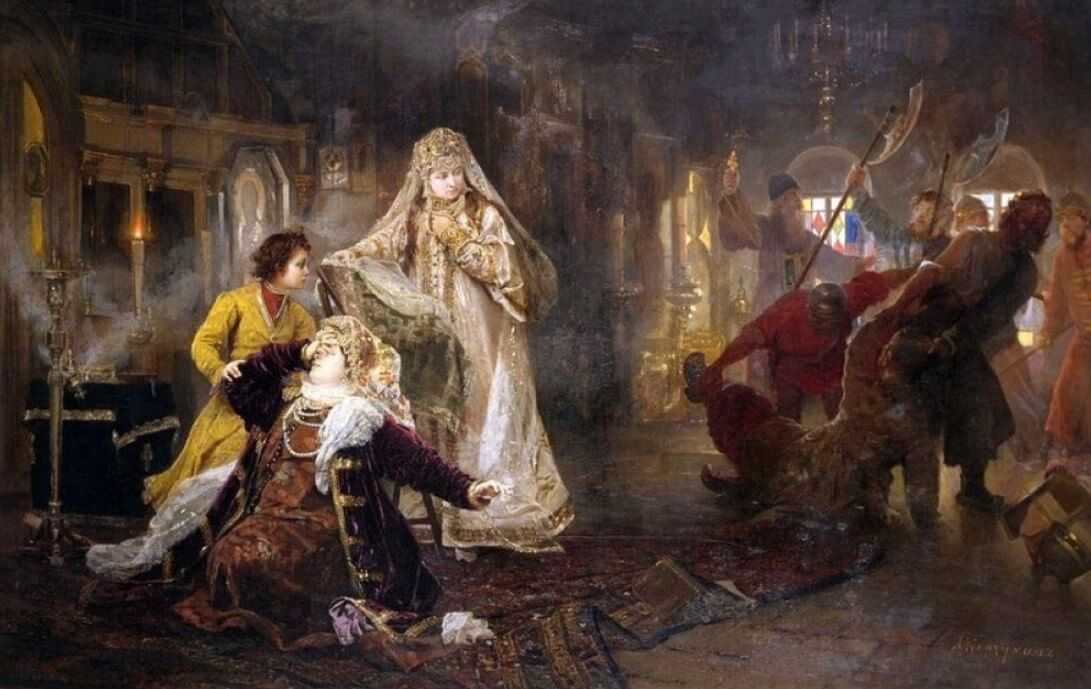 А. И. Корзухин «Мятеж стрельцов» в 1682 г. Стрельцы выволакивают из дворца Ивана Нарышкина. Царевич Пётр утешает мать, а царевна Софья наблюдает с удовлетворением