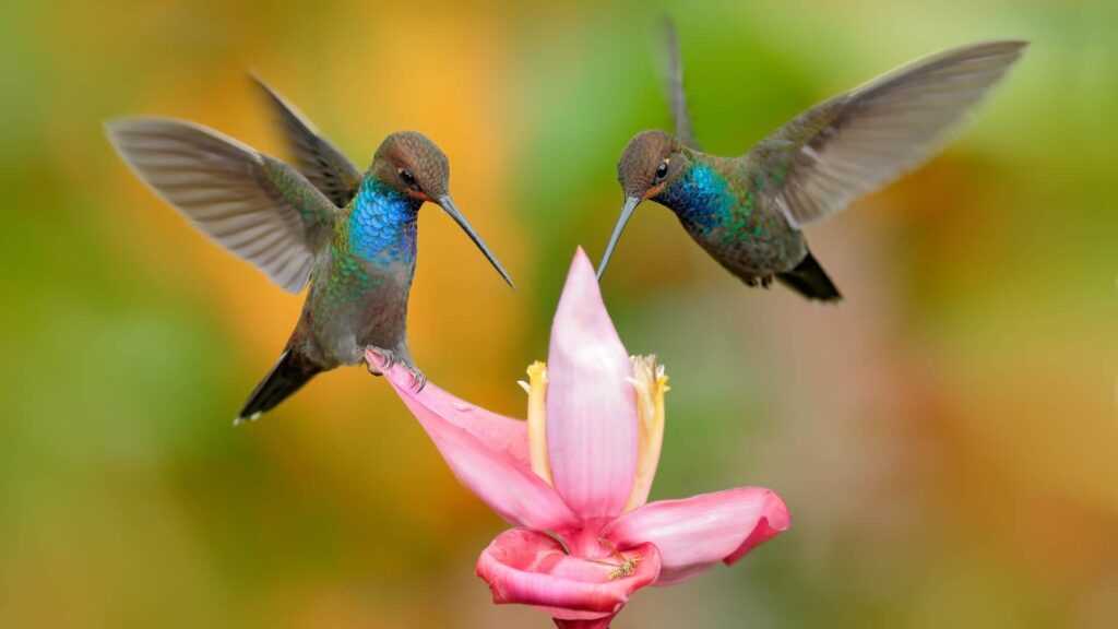 Колибри — самые маленькие птицы на Земле. Их размеры не превышают 21 см. В Южной Америке встречается до 300 видов этих маленьких птичек. Колибри — очень умелые летуны. Эти маленькие птички способны летать в любых направлениях. И задом наперед тоже! К тому же колибри умеют зависать в воздухе. Этим трюком они регулярно пользуются, когда лакомятся цветочным нектаром.