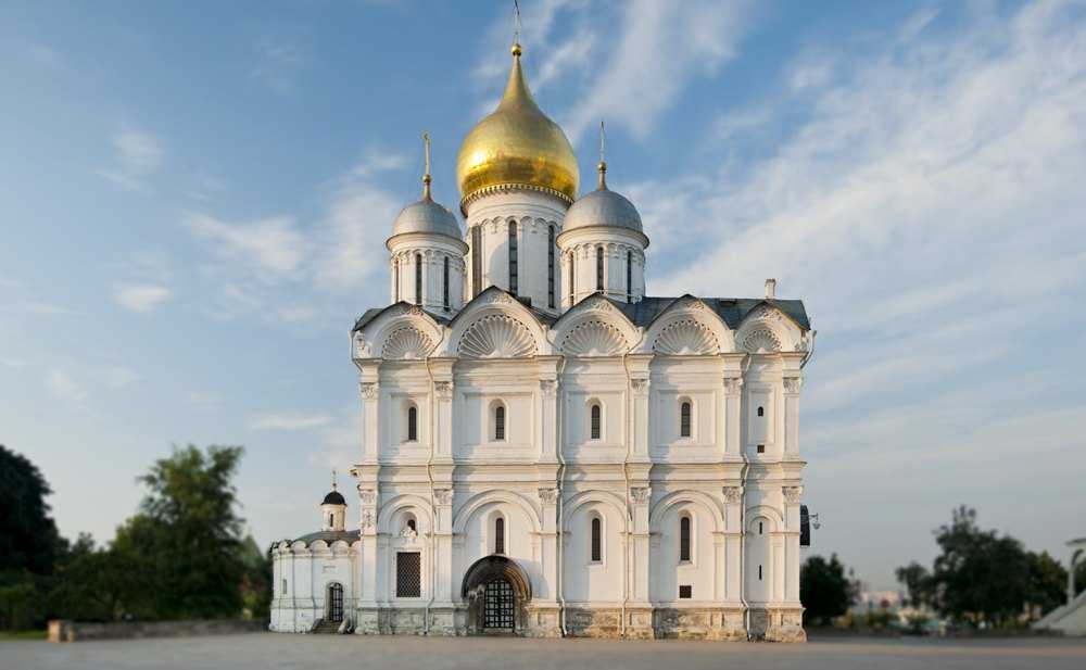 Архангельский собор возведен в начале XVI века по проекту миланского архитектора Алеваза Фрязина. В облике – сочетание элементов итальянской и русской архитектуры. Построенный из кирпича, он декорирован белым камнем, сложный карниз украшен каменной резьбой.