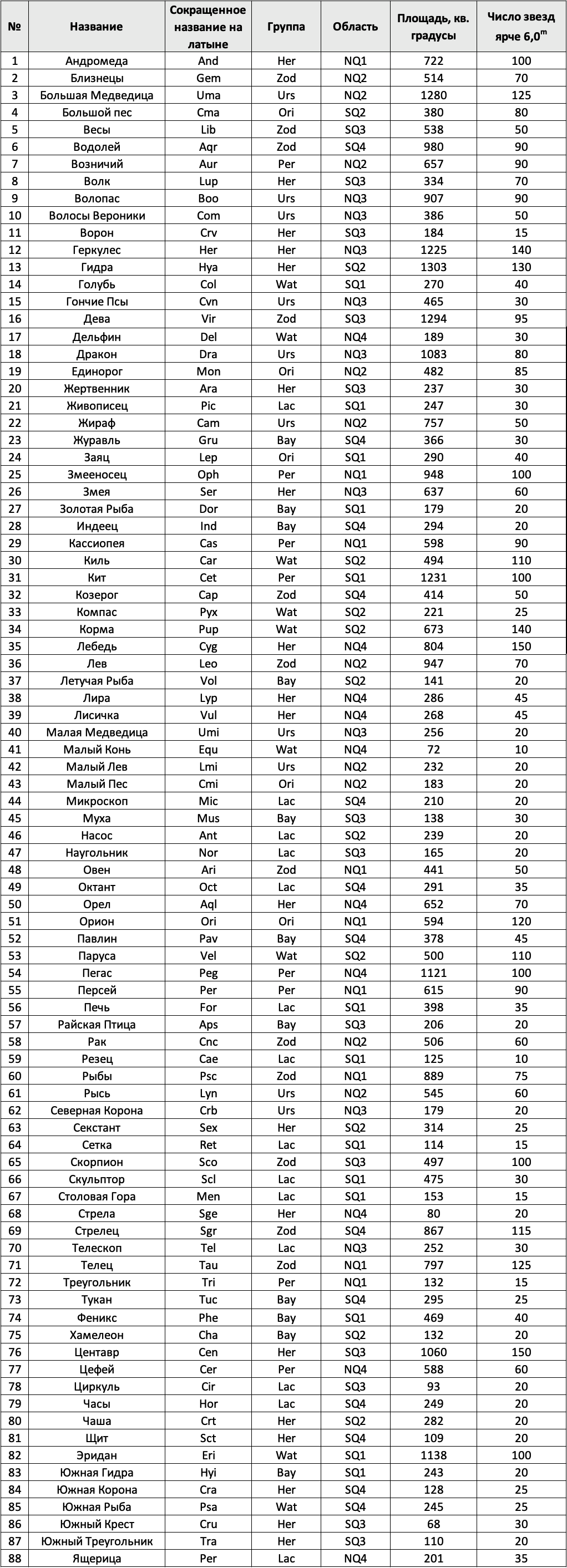 Звездное небо поделено на 88 созвездий. Каждое имеет имя, аббревиатуру на латинском, группу и область расположения.