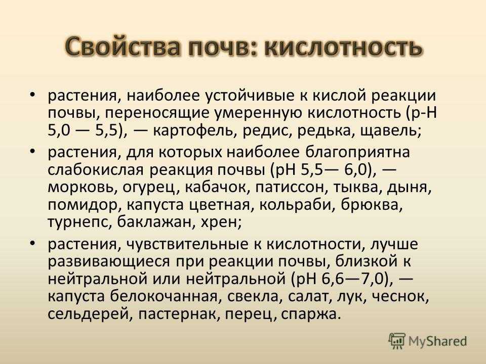 растения, наиболее устойчивые к кислой реакции почвы, переносящие умеренную кислотность (р-Н 5,0 5,5), картофель, редис, редька, щавель; растения, для которых наиболее благоприятна слабокислая реакция почвы (рН 5,5 6,0), морковь, огурец, кабачок, патиссон, тыква, дыня, помидор, капуста цветная, кольраби, брюква, турнепс, баклажан, хрен; растения, чувствительные к кислотности, лучше развивающиеся при реакции почвы, близкой к нейтральной или нейтральной (рН 6,67,0), капуста белокочанная, свекла, салат, лук, чеснок, сельдерей, пастернак, перец, спаржа.