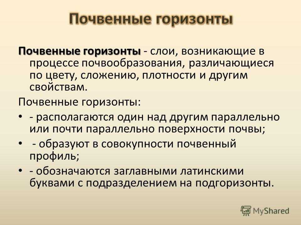 Почвенные горизонты Почвенные горизонты — слои, возникающие в процессе почвообразования, различающиеся по цвету, сложению, плотности и другим свойствам. Почвенные горизонты: — располагаются один над другим параллельно или почти параллельно поверхности почвы; — образуют в совокупности почвенный профиль; — обозначаются заглавными латинскими буквами с подразделением на подгоризонты.