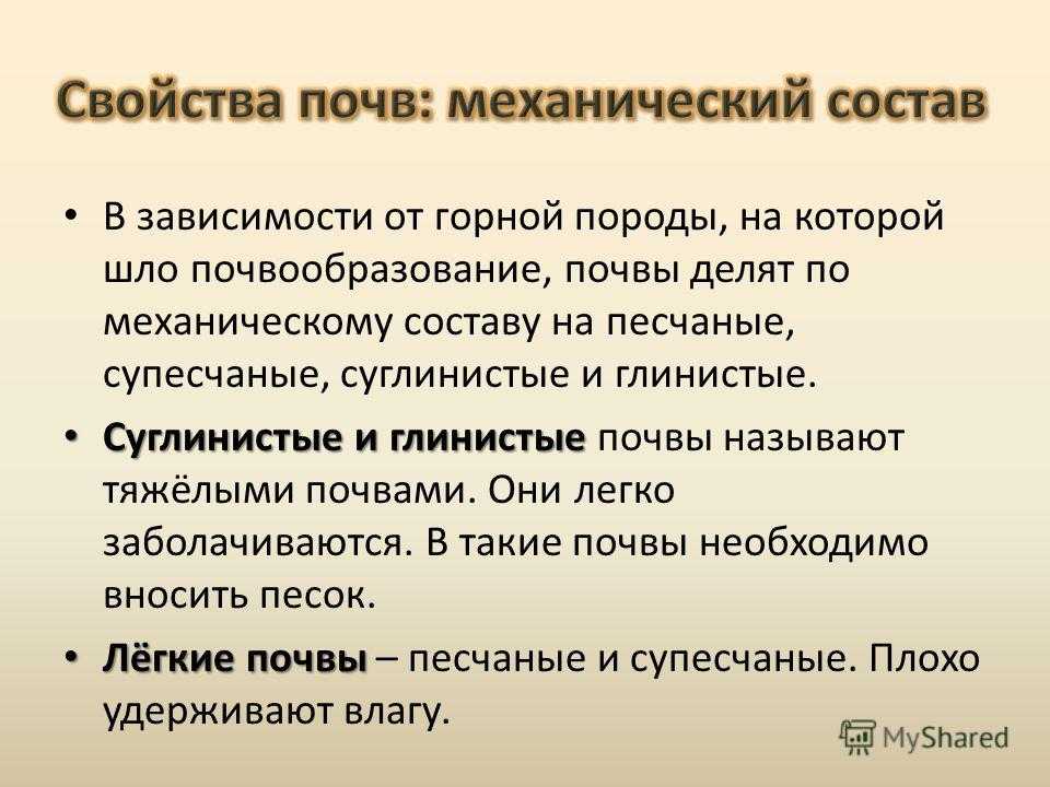 В зависимости от горной породы, на которой шло почвообразование, почвы делят по механическому составу на песчаные, супесчаные, суглинистые и глинистые. Суглинистые и глинистые Суглинистые и глинистые почвы называют тяжёлыми почвами. Они легко заболачиваются. В такие почвы необходимо вносить песок. Лёгкие почвы Лёгкие почвы – песчаные и супесчаные. Плохо удерживают влагу.