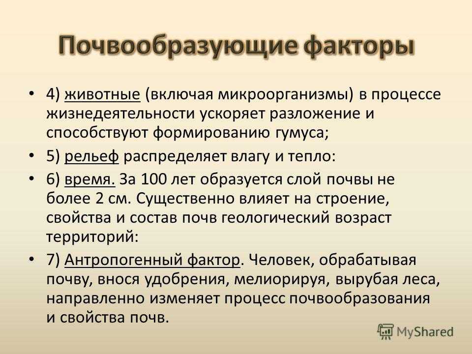 4) животные (включая микроорганизмы) в процессе жизнедеятельности ускоряет разложение и способствуют формированию гумуса; 5) рельеф распределяет влагу и тепло: 6) время. За 100 лет образуется слой почвы не более 2 см. Существенно влияет на строение, свойства и состав почв геологический возраст территорий: 7) Антропогенный фактор. Человек, обрабатывая почву, внося удобрения, мелиорируя, вырубая леса, направленно изменяет процесс почвообразования и свойства почв.