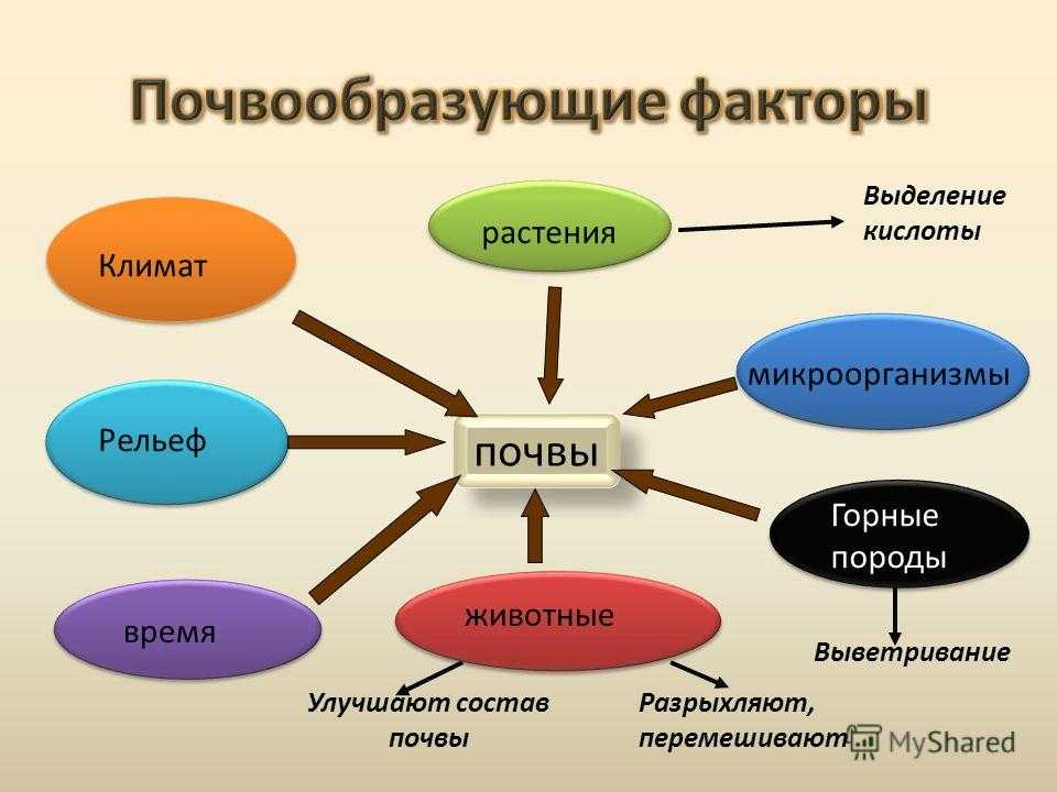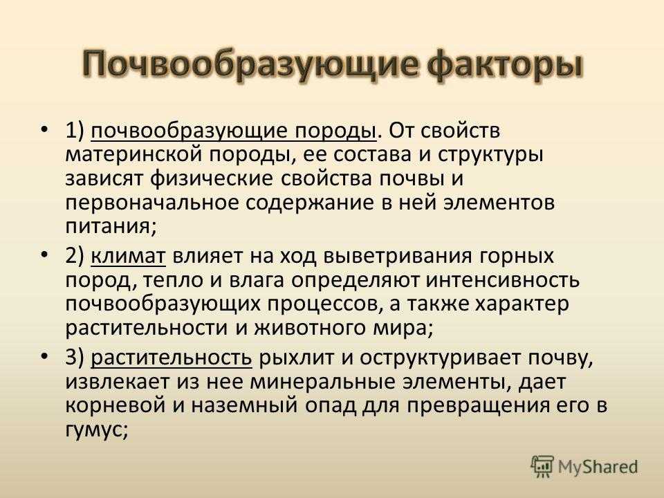 1) почвообразующие породы. От свойств материнской породы, ее состава и структуры зависят физические свойства почвы и первоначальное содержание в ней элементов питания; 2) климат влияет на ход выветривания горных пород, тепло и влага определяют интенсивность почвообразующих процессов, а также характер растительности и животного мира; 3) растительность рыхлит и оструктуривает почву, извлекает из нее минеральные элементы, дает корневой и наземный опад для превращения его в гумус;
