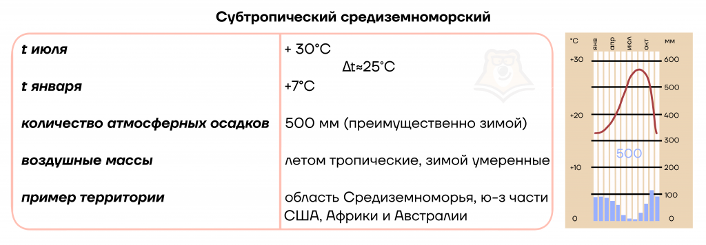 Субтропический климатический пояс – переходный пояс между тропическим и умеренным. Значит, в нём летом будут действовать тропические воздушные массы (ВМ), а зимой – умеренные.