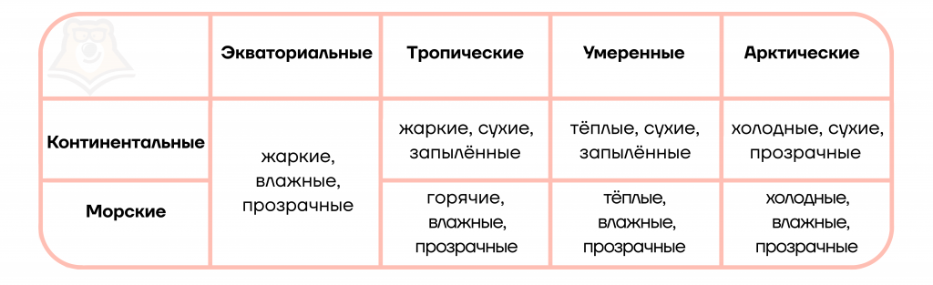 | Везде ли выпадают осадки?От господствующих ВМ зависит сезонность осадков в субпоясах, а в основных поясах осадки будут равномерными в течение всего года. Ниже в табличке вы можете просмотреть характеристики основных ВМ. В субпоясах они будут влиять попеременно: летом приходит более тёплый, зимой – холодный. Так что промозглый неприятный дождь на райских Мальдивах вполне возможен. |