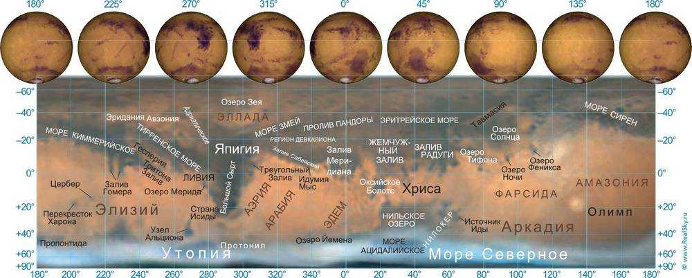 Если смотреть на Марс в мощный телескоп, можно заметить, что 2/3 его поверхности более светлые – их называют материками. Остальная треть более темная – эти области называют морями. Конечно, эти моря – просто безжизненные пустыни, где нет ни капли воды, но названия прижились.