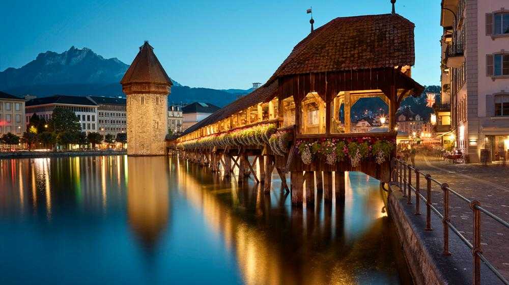 Построенный в 1333 году и сильно пострадавший от пожара в 1993 году, Часовенный мост в Люцерне (Kapellbrücke) был почти сразу восстановлен, чтобы сохранить статус самого старого деревянного моста в Европе. 204-метровый мост соединяет два берега реки Рёйсс, изгибаясь возле 43-метровой каменной башни, бывшей когда-то тюрьмой и сокровищницей
