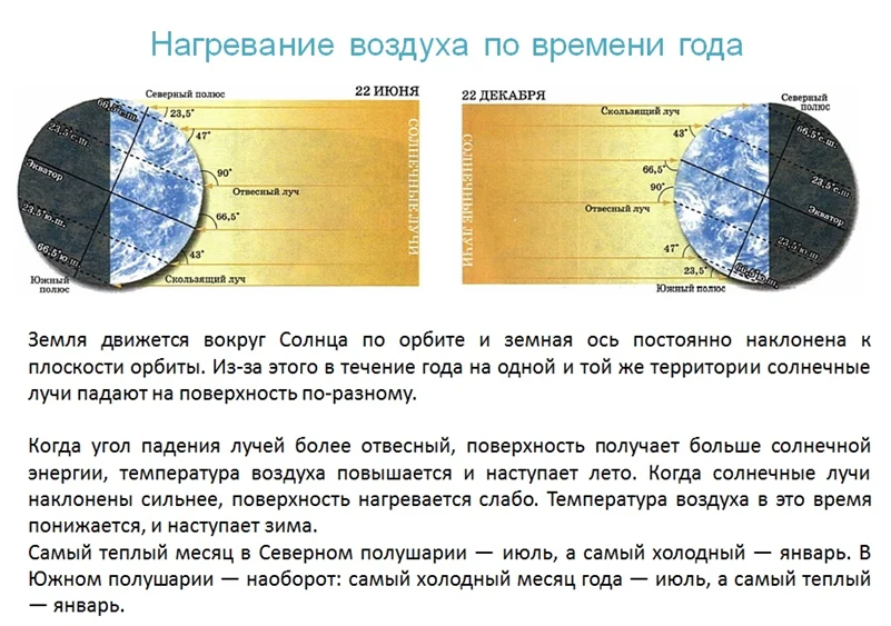 На протяжении суток температура сильно колеблется, соответственно нагревание и охлаждение воздуха находятся в зависимости от угла падения солнечных лучей. Угол 90, предполагает значительное количество тепла, прибывающее на землю. Объясняется все это осевым вращением планеты. Вспомнить о нем можно в курсе 5 класса урок 3 «Земля во Вселенной».